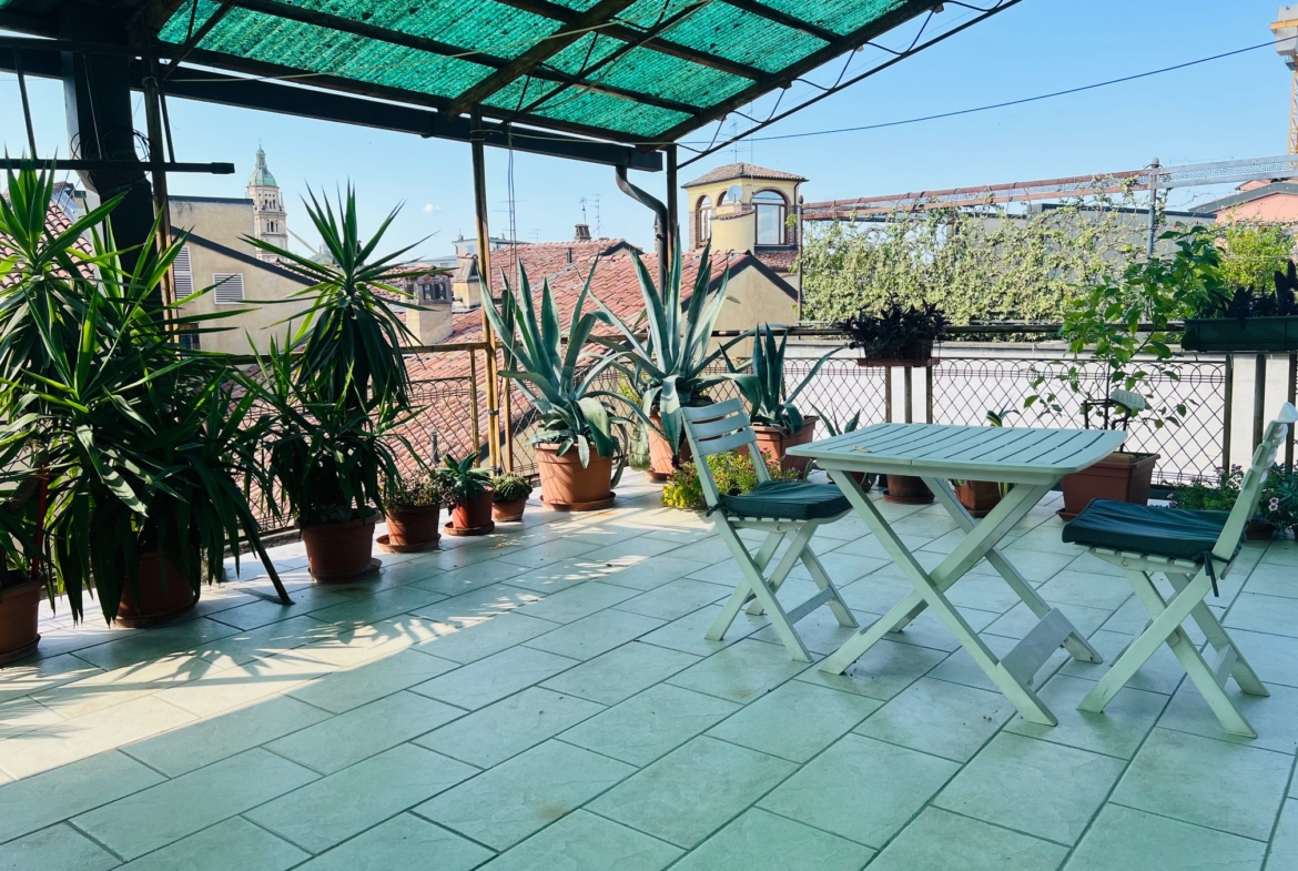 Gli spazi interni si articolano in ingresso, soggiorno, cucina abitabile, due camere da letto e bagno. Adiacente all’abitazione si trova un ampio terrazzo comune di 50 mq, elemento distintivo dell’immobile, con vista aperta sui tetti del centro storico. Completa la proprietà la cantina.